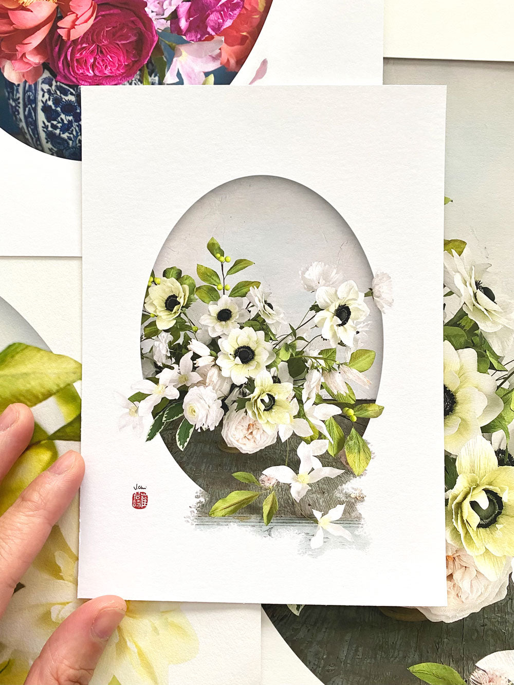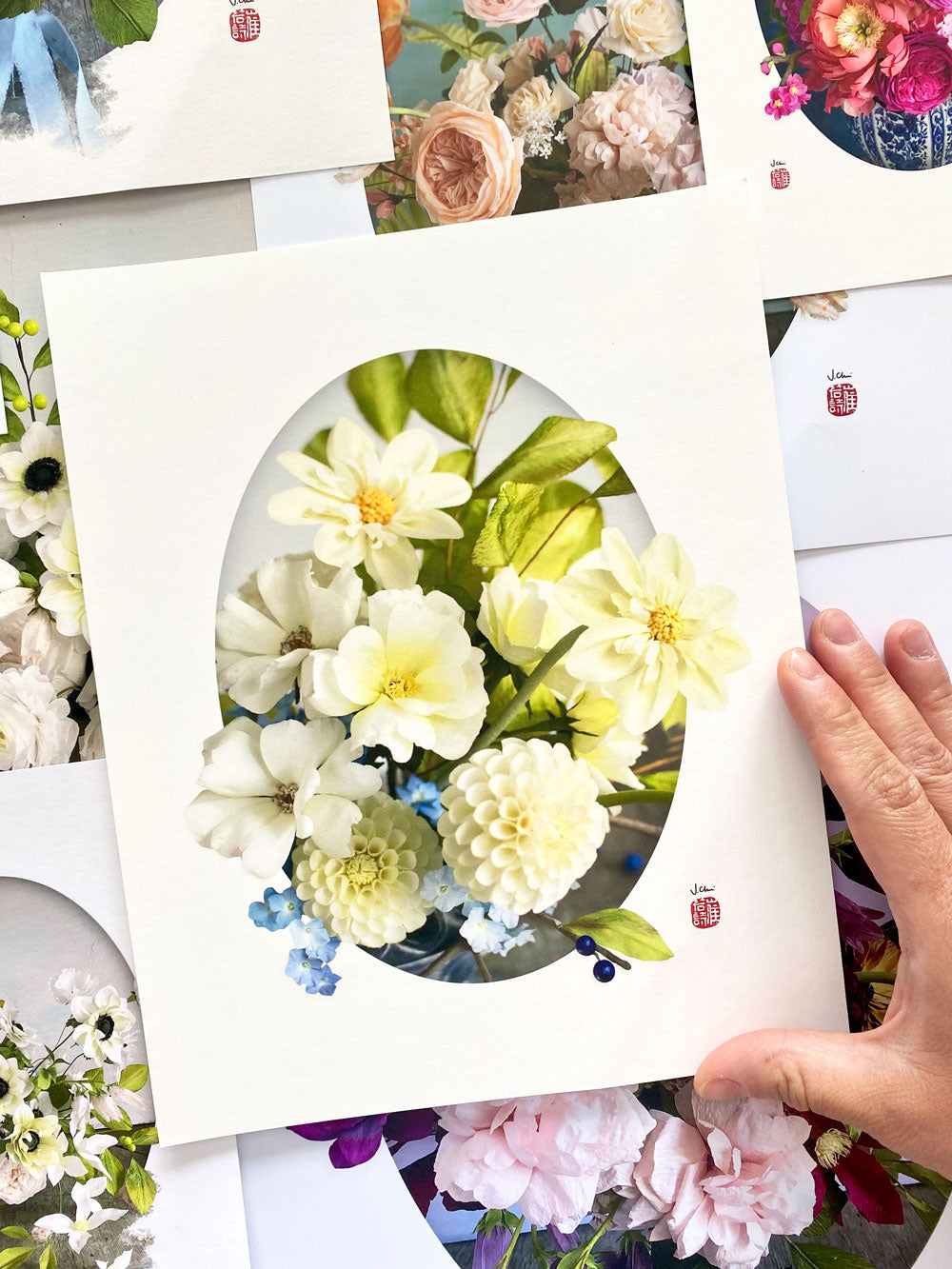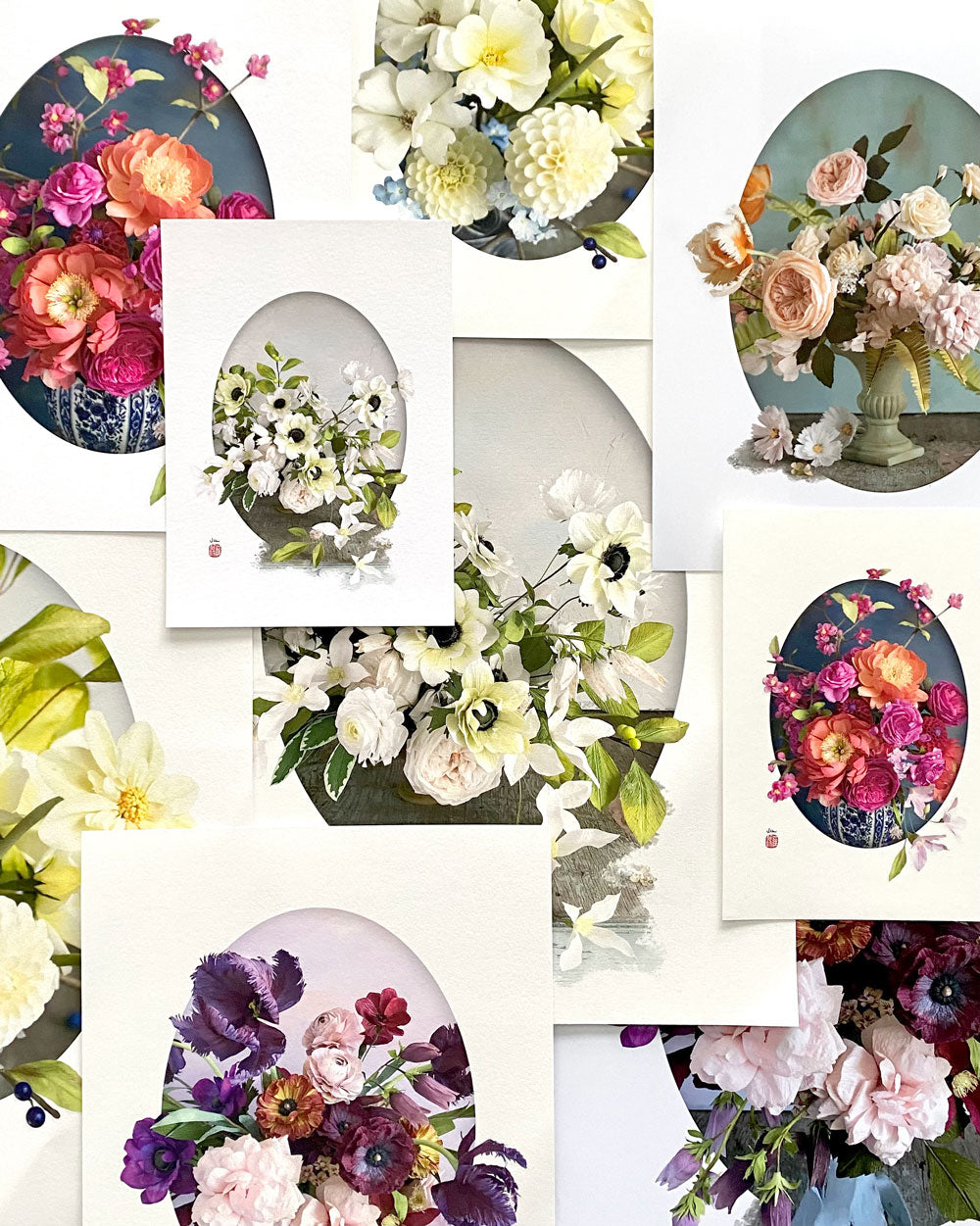 Using digital magic, the images of these arrangements now sit behind a white frame with bits and pieces of flowers and vines reaching out creating a more immersive experience for the viewer.